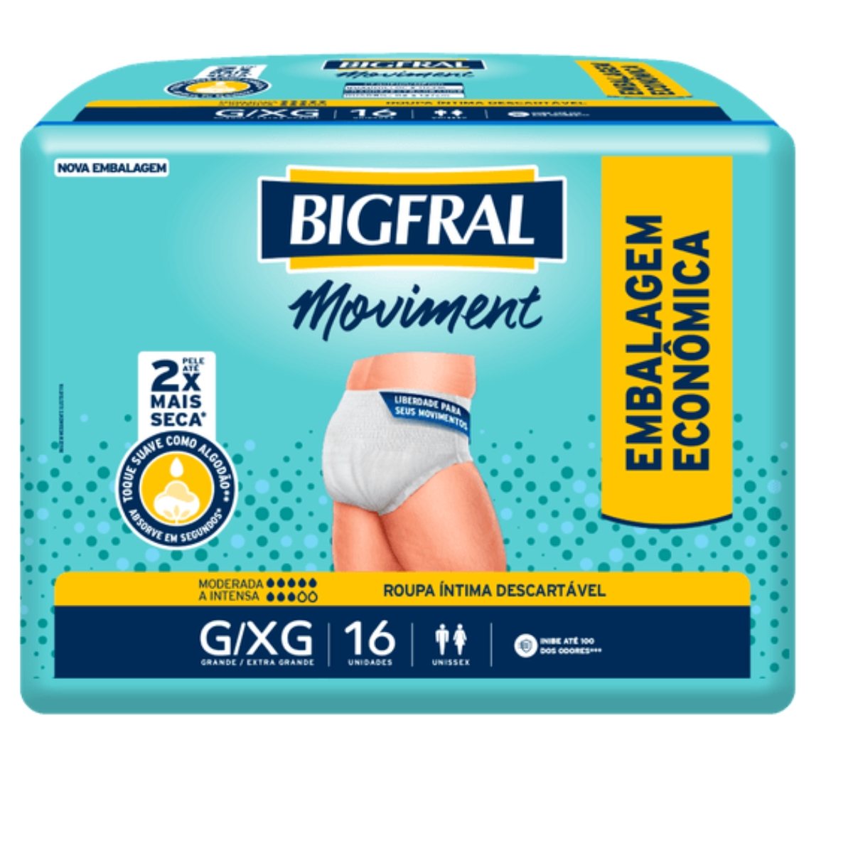 Bigfral Moviment Roupa Íntima Descartável foi desenvolvida para homens e mulheres com incontinência moderada a intensa. Absorve em segundos mantendo a umidade longe da pele e deixando-a até 2x mais seca. As barreiras de proteção antivazamento e o controle de até 100% dos odores proporcionam segurança e conforto.